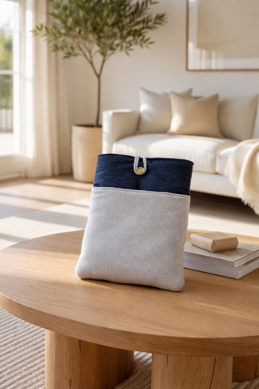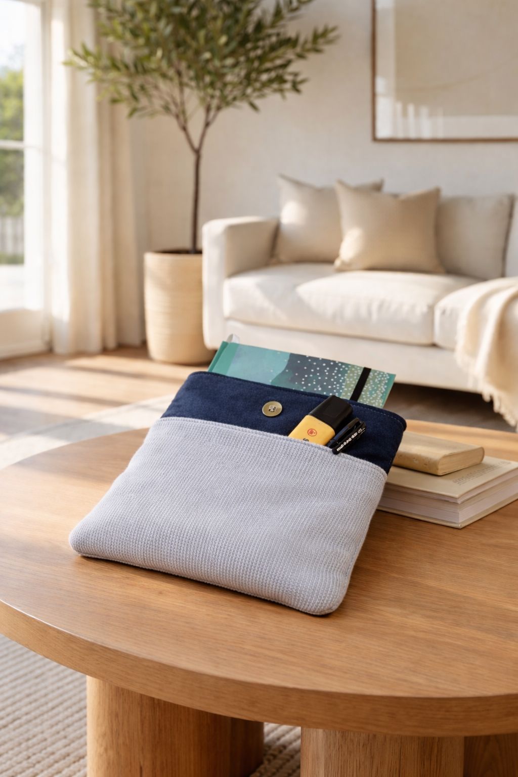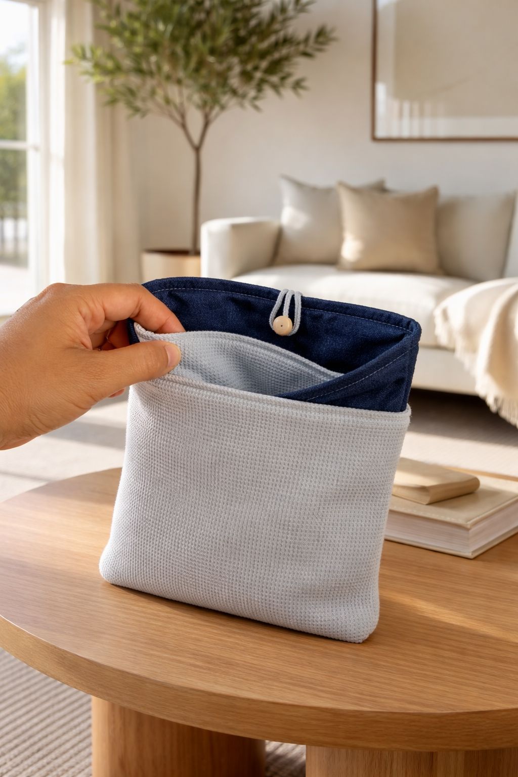 Su cierre con botón mantiene el contenido protegido, mientras que su diseño atemporal en tonos neutros la convierte en un accesorio versátil, ideal para el hogar, la oficina o llevar contigo a cualquier lugar.